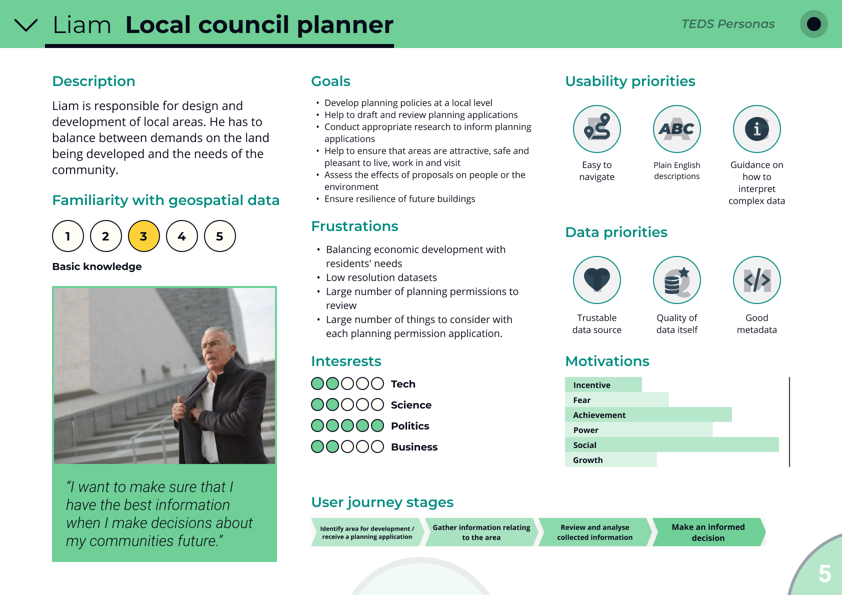Below you can find some persona examples showing different types of user groups which could benefit from environmental data and services. They show how familiar each groups is with geospatial data and what are their goals, priorities and frustrations. These personas helped us to present research findings in a more digestible form and to keep user needs and frustrations at the forefront when thinking about new environmental data products and services that could benefit them.